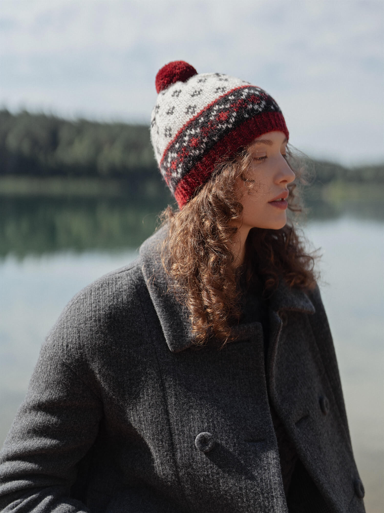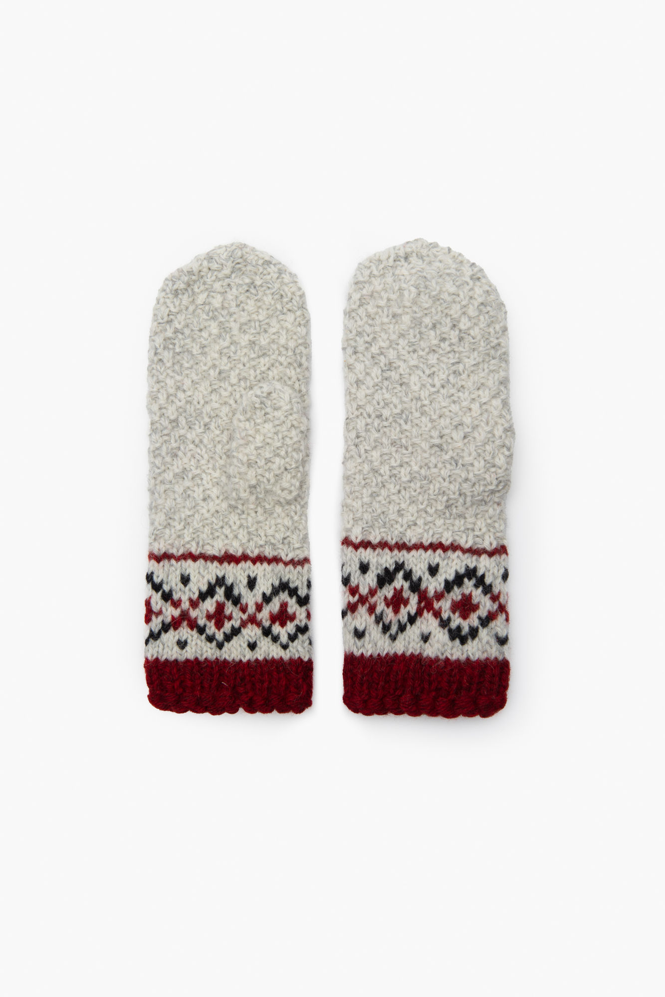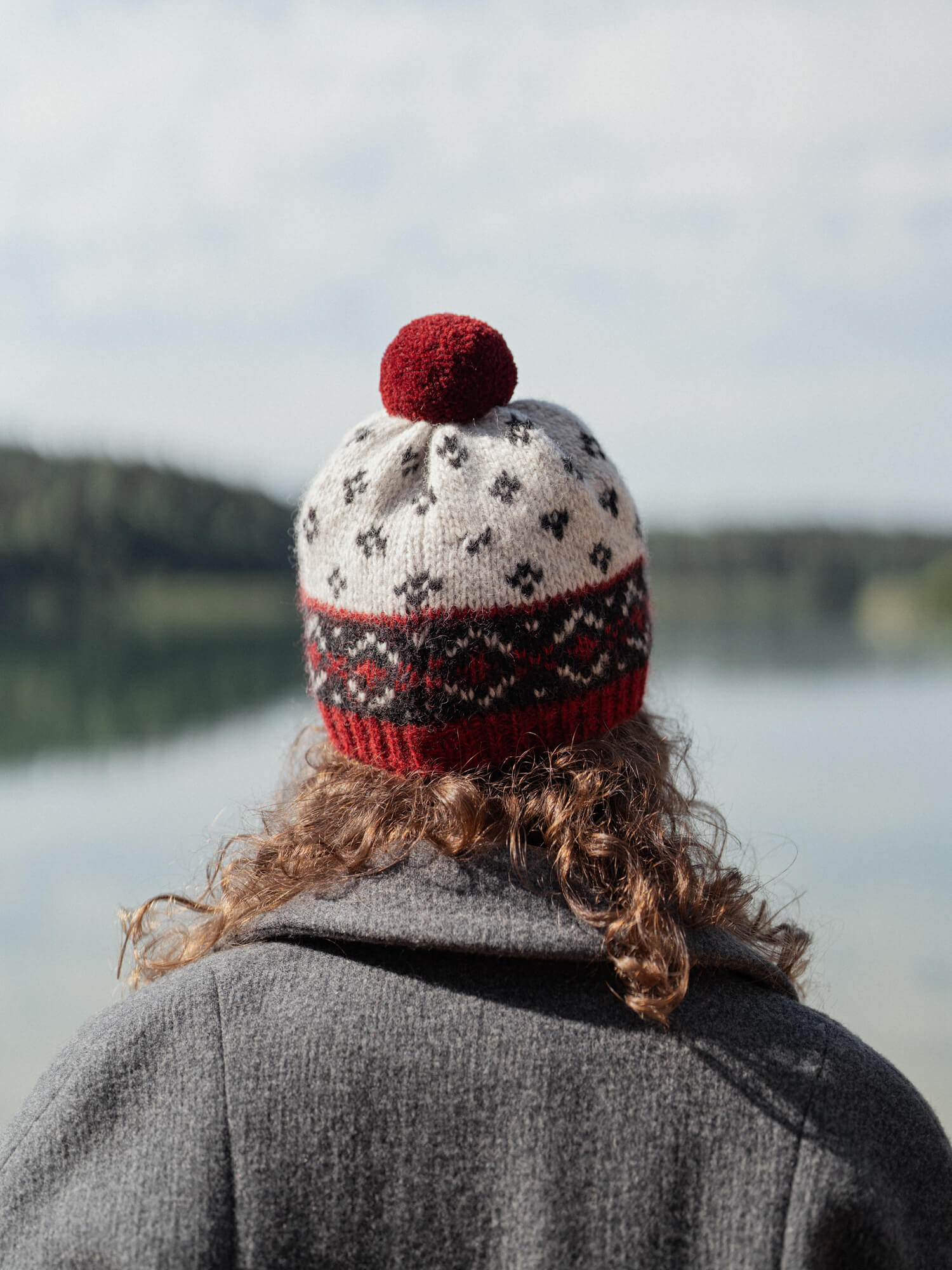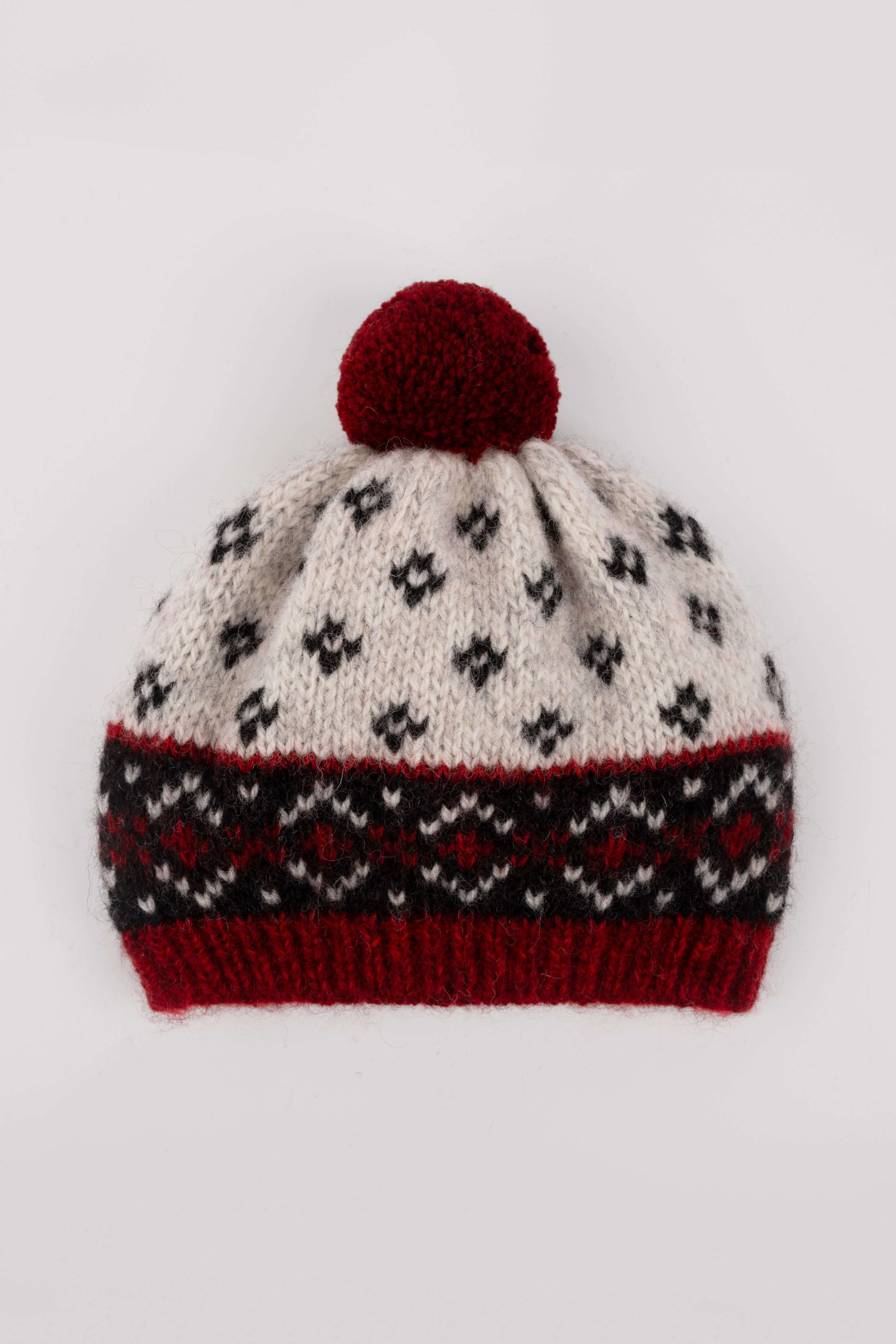 Vieno dydžio natūralios vilnos kepurė su kutu. Rankų darbo žieminė vilnos kepurė puikiai apsaugo nuo šalčio ir vėjo. Vilnonė kepurė puošta autentiškais pilkos, juodos ir raudonos spalvų raštais. Puikiai tinkanti tiek moterims, tiek vyrams. Šiuo metu kepurės gaminamos be WOOL HOUSE logo ženkliuko.
