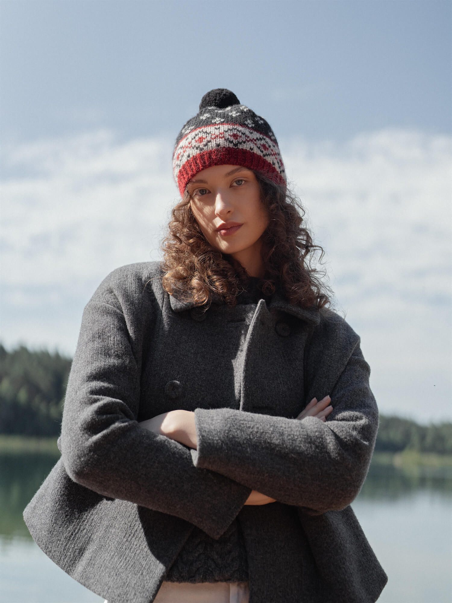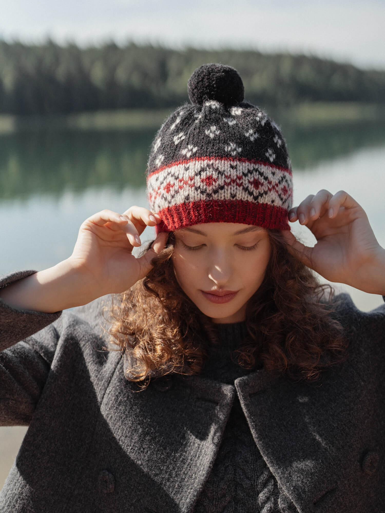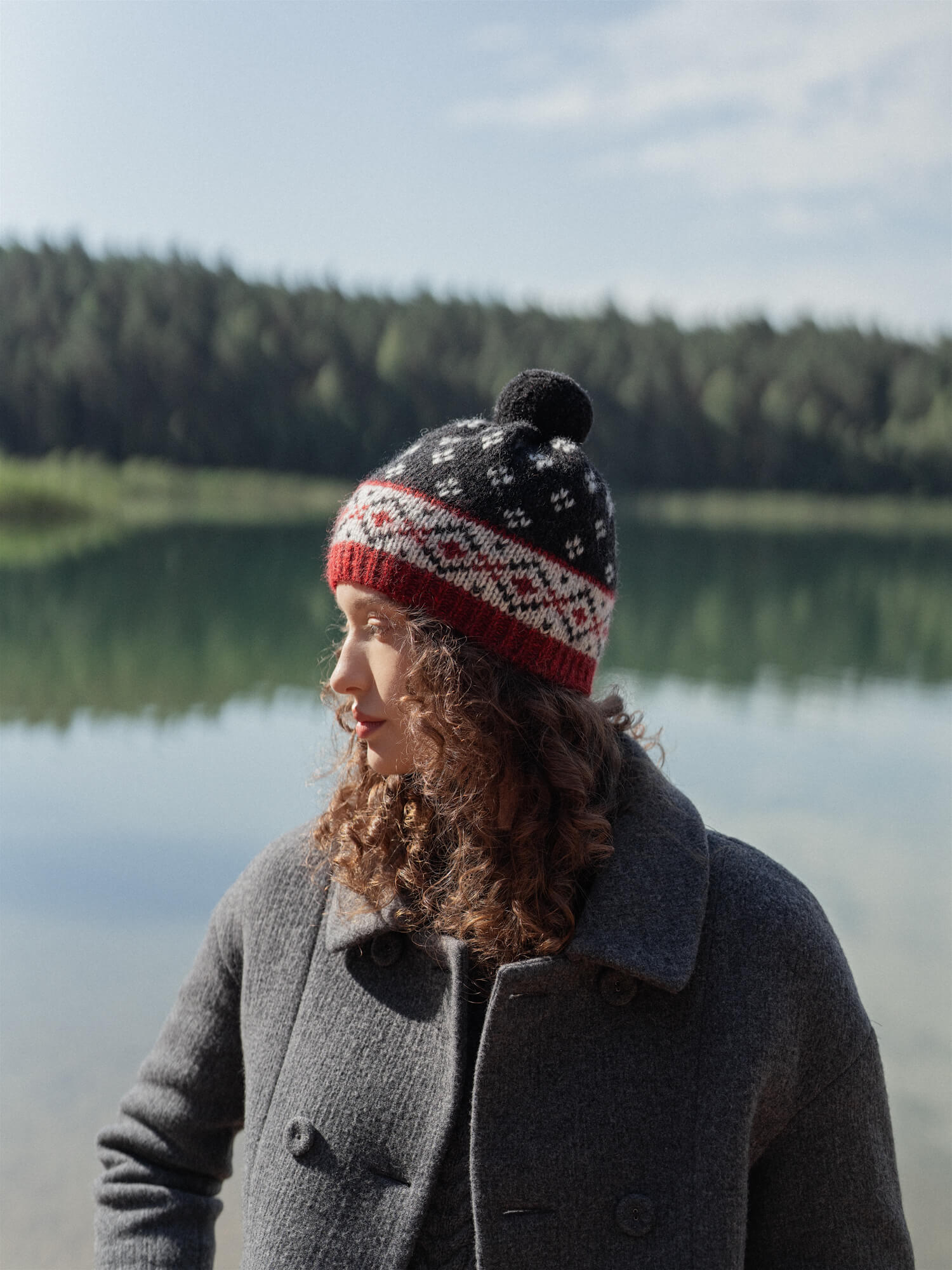 Vieno dydžio natūralios vilnos kepurė su kutu. Rankų darbo žieminė vilnos kepurė puikiai apsaugo nuo šalčio ir vėjo. Vilnonė kepurė puošta autentiškais pilkos, juodos ir raudonos spalvų raštais. Puikiai tinkanti tiek moterims, tiek vyrams. Šiuo metu kepurės gaminamos be WOOL HOUSE logo ženkliuko.