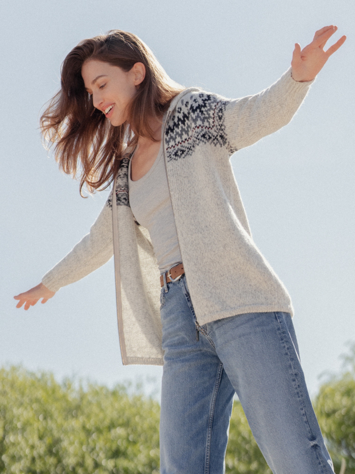 Įkvėptas skandinaviškos nuotaikos ir gamtos gyvybės kardiganas puoštas šiaurietiškais raštais bei gobtuvu. Priekyje užsegamas užtrauktuku.